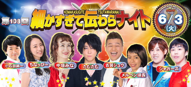 2023年12月18日(月) Posted on 2023年10月31日2024年1月5日 by kisara 【第68回細かすぎて伝わらナイト】 古賀シュウとむやむくん中垣みなRocky石井メルヘン須長小川美佳MC小石田純一